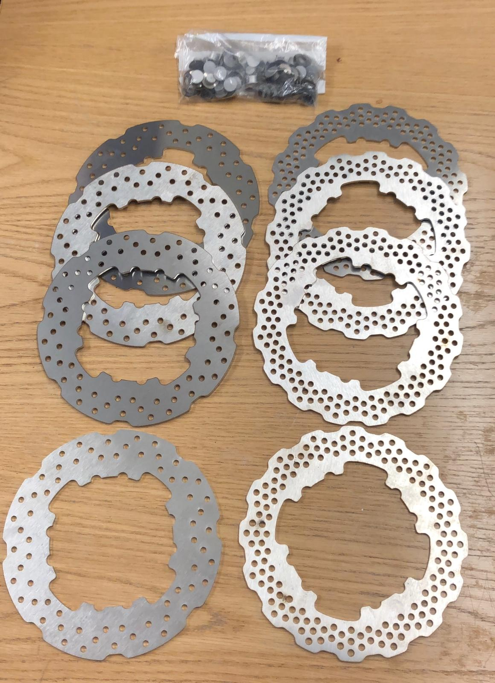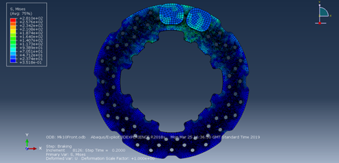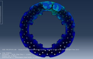 The braking system encompasses the hydraulic circuit and its components which is used to slow down and stop the vehicle. It needed completely redesigned for our new 10” wheels and UGR-19 sees the use of 4 custom Disc Brakes with two separate hydraulic circuits for front and rear. The system uses lightweight callipers and minimal reservoirs along with a bespoke pedal box optimised for driver use. The Stainless-Steel discs are designed to maximise pad bite, have optimal thermal efficiency and be as lightweight as possible. This was the first time I had ever used FEA simulation software, so it was a challenge to set this up however mechanical stress testing was carried out on the brake discs, image below. This system is lighter than UGR-18’s and effectively works with the new 10” Wheels.