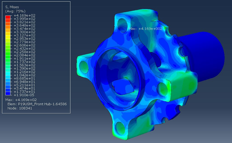 Weight saving was also very important for this year’s USM team, especially with our change down to 10” wheels. To ensure that the hubs were as light as possible I introduced some very nice weight saving pockets into both the front and rear hubs. This was done by simulating the hubs using ABAQUS FEA and iteratively deciding where material was at its lowest stress and removing this from the final design.