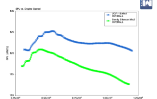The graphs plot engine speed, in revolutions per minute, against measured sound level, in dB(C). This curve was produced by the software Ricardo WAVE, and shows the sound level produced by the car as the driver revs the engine higher. The blue line is the sound profile of the silencer used by UGR-18, last years car, and the green the so called “bent tube” silencer. Although the graph does not predict it will be 110 dB(C) or less when it reaches 11,000 RPM, WAVE has not been 100% accurate in its predictions. To combat this, a sound drop of 6 dB was aimed for, as UGR-18 was 6 dB over the permitted level. This bent tube achieves a drop of 8 dB, which should put it below the maximum level. The next step is to test the design on the car and see how closely the results tie in with those achieved in the simulations.
