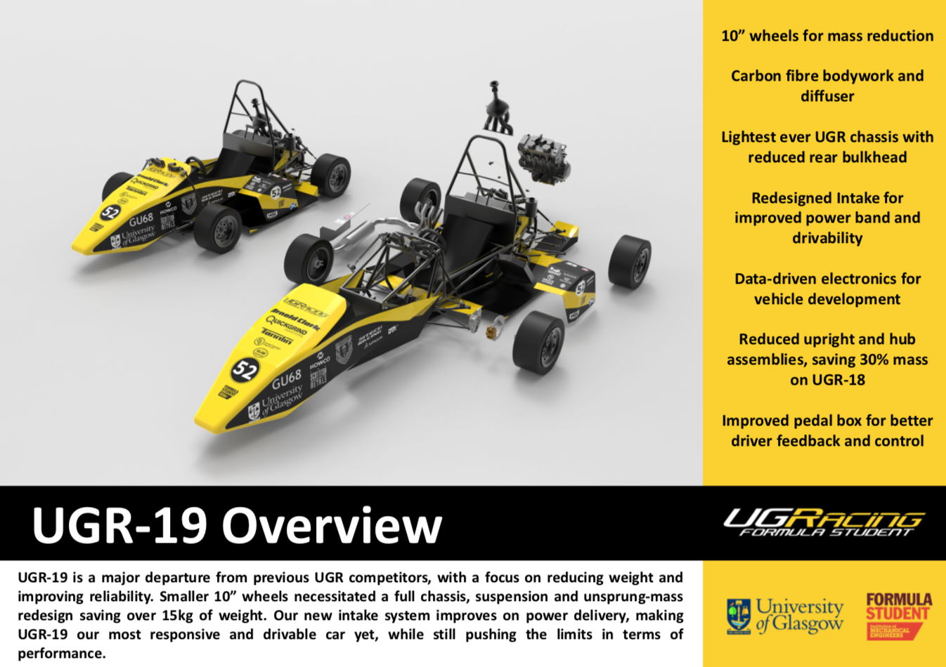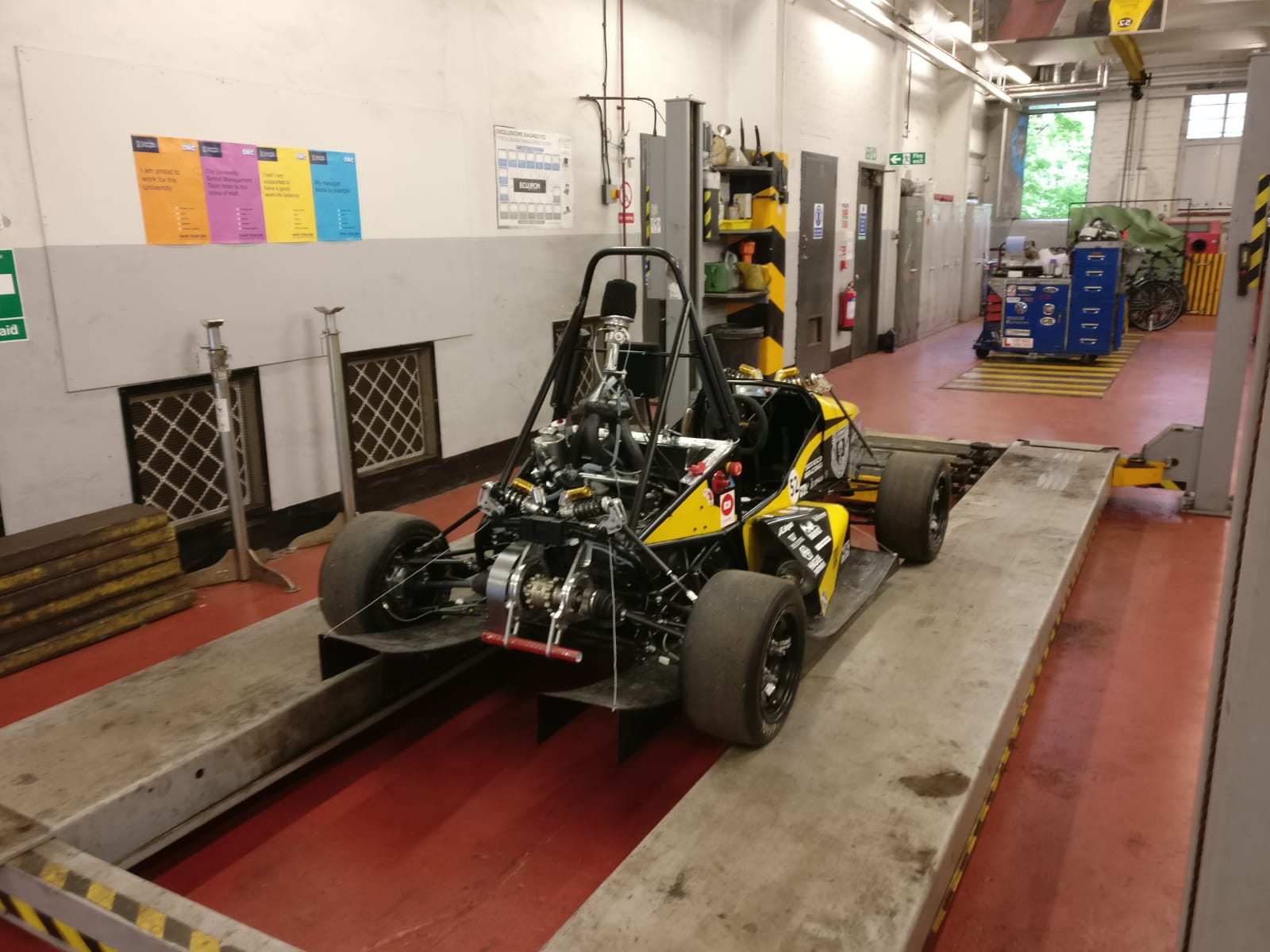 Today the team took UGR-19 down to the University Garage to be scrutineered. The guys who work in the garage kindly do this for us every year and it allows us to be insured. They were very pleased with how the cars looking and so we’re now all ready for testing!